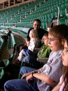 So today, we ventured forth to a Monster Truck Jam. It has been on our bucket list ever since Toothsome #1 was about two and it was high time to cross it off. Here we are at the stadium. We took the local Trax train downtown, which dropped us right off at the entrance. (Oh and there were a lot more people there then this picture looks like. We had a great group of tattooed people behind us.)
